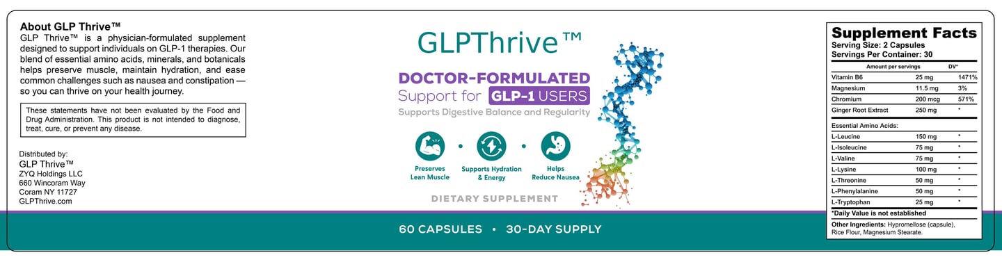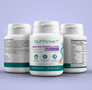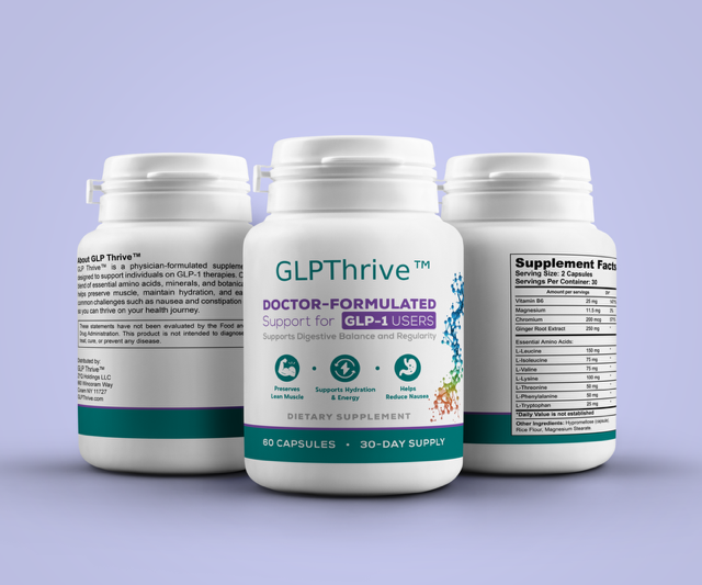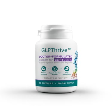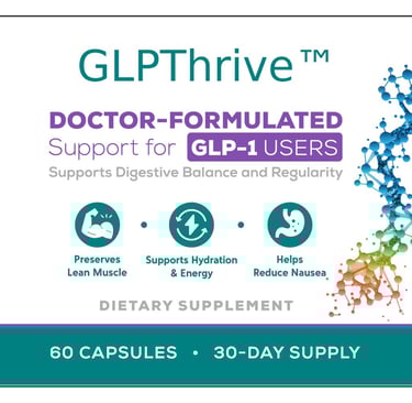 GLPThrive™—A supplement formulated by physicians to specifically assist individuals undergoing GLP-1 treatments. Each capsule blends clinically researched ingredients with practical medical insights to meet the distinct requirements of GLP-1 users.